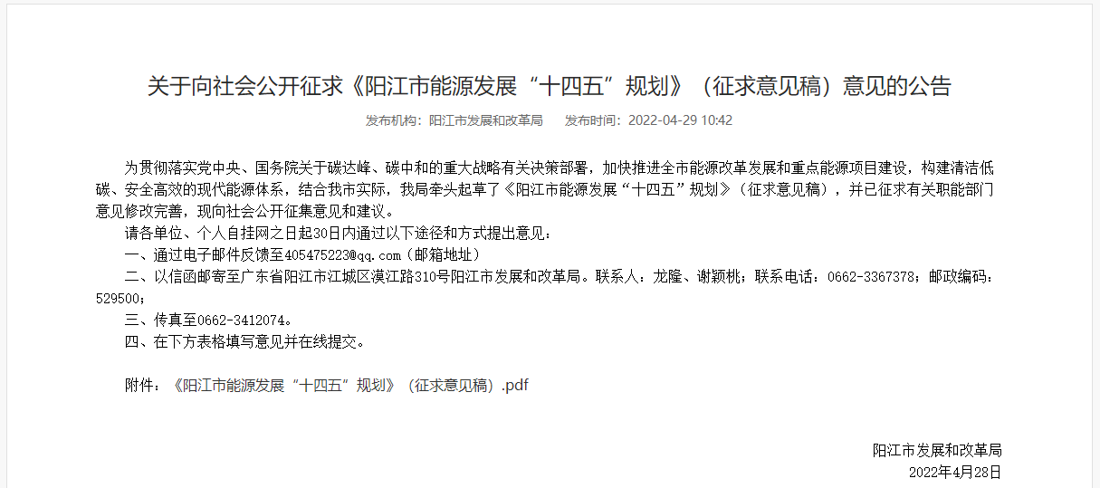 近日,阳江市人民政府发布关于向社会公开征求《阳江市能源发展“十四五”规划》(征求意见稿)意见的公告。
