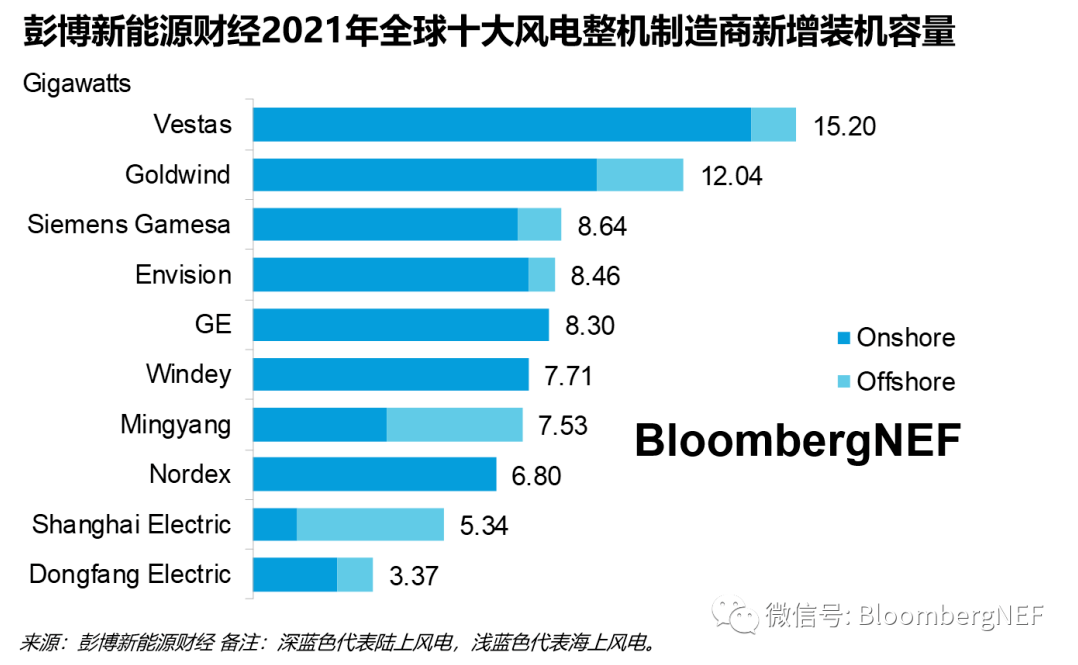 3月23日,彭博新能源财经公布2021年全球风电整机制造商市场份额排名,数据显示,2021年全球风电新增装机容量达到99.2GW的历史最高水平,连续第二年全球装机量逼近100GW。其中陆上风电装机82.3GW,占比83%;海上风电装机16.8GW,相较于2020年增长161%。