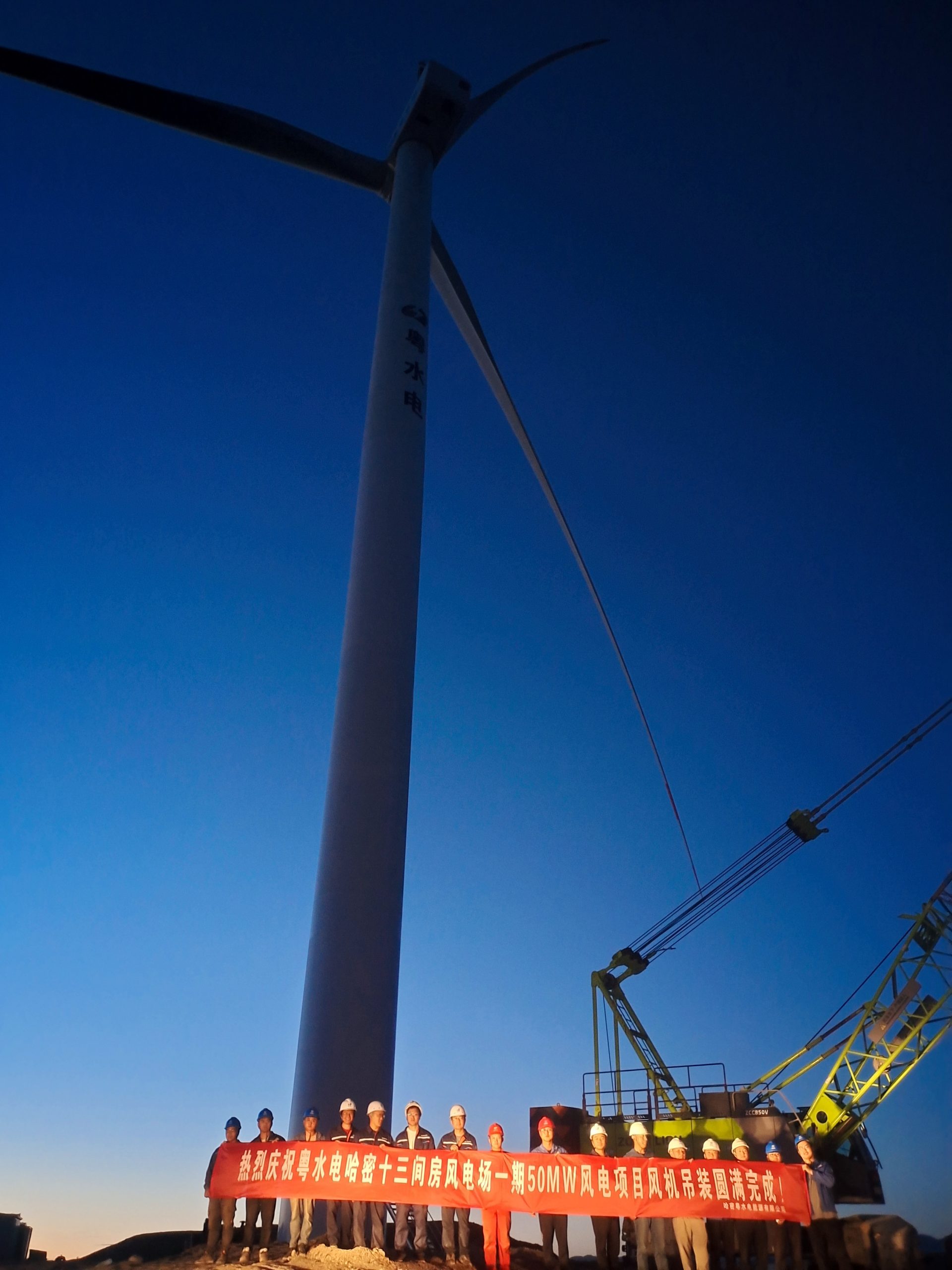 6月23日凌晨2时48分,随着最后一台风机轮毂和机舱在百米高空的精准对接,粤水电新疆能源公司哈密十三间房一期50兆瓦风电项目8台6.25兆瓦风力发电机组全部顺利吊装完成,这意味着粤水电陆上最大单机风电机组全部完成吊装。