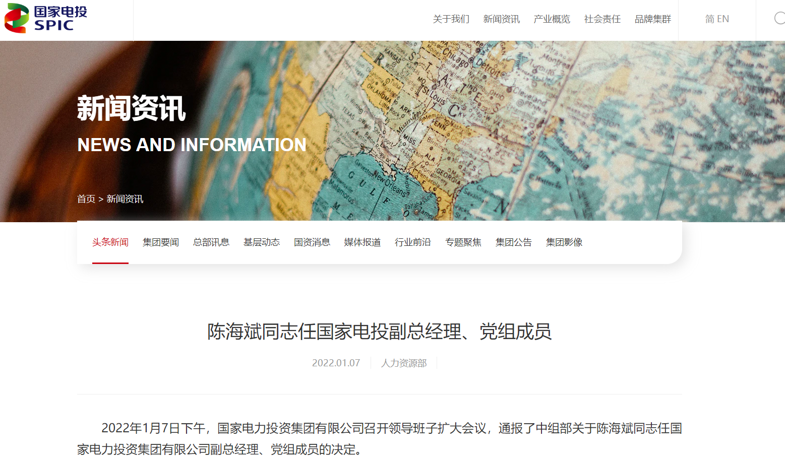 2022年1月7日下午,国家电力投资集团有限公司召开领导班子扩大会议,通报了中组部关于陈海斌同志任国家电力投资集团有限公司副总经理、党组成员的决定。上述任命按有关法律规定办理。