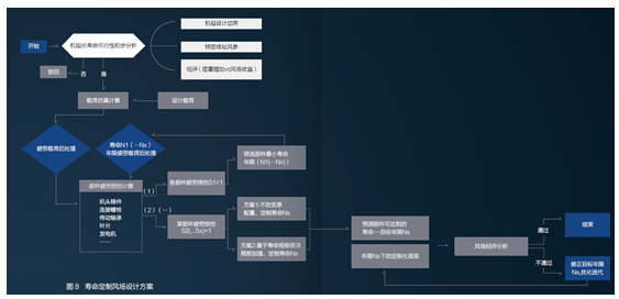 新建风场寿命定制过程是依据风电场实际边界条件,对拟安装机组进行特定场址载荷分析,并结合机组的设计载荷和各部件的疲劳设计裕度获得各部件在风场条件下的原始寿命,进而得到风场寿命的初步评估结果。另外,也可对某些部件进行局部加强以延长整机寿命,并针对不改变原机组配置下的寿命和部件局部加强后的新寿命进行经济性分析,最终选取最优的风场寿命定制方案。