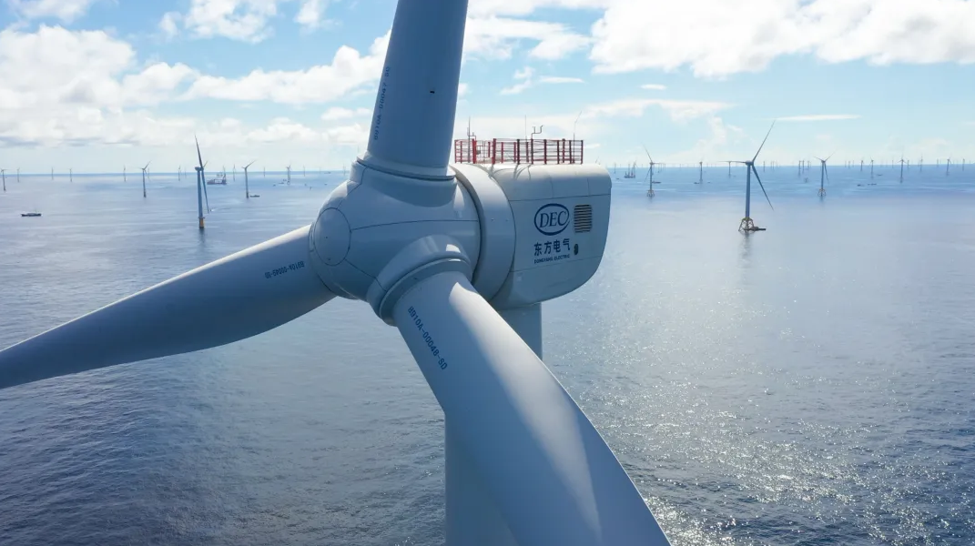 东方电气针对中国大部分海域平均风速低、盐雾腐蚀强、台风强等特点,定制化开发的DEW-D7000-186海上抗台风型风力发电机组,单机容量7兆瓦,叶轮直径186米,具备安全可靠性高、发电性能卓越、工程造价低、运维成本低等特点。