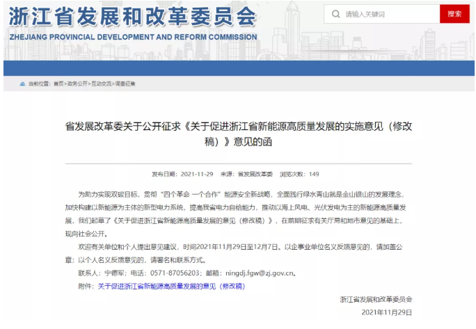 11月29日,浙江省发改委发布《关于促进浙江省新能源高质量发展的实施意见(修改稿)》,《意见稿》提出,大力推进“风光倍增工程”。稳步推动海上风电平价上网。按照“逐步退坡、鼓励先进”的原则逐年制定海上风电上网电价,实施财政、金融等支持,支持省管海域海上风电项目逐步实现平价上网。2022-2025年通过竞争性配置确定需要扶持的项目,分年度装机总容量分别不超过 50万千瓦、100万千瓦、150万千瓦、100万千瓦。