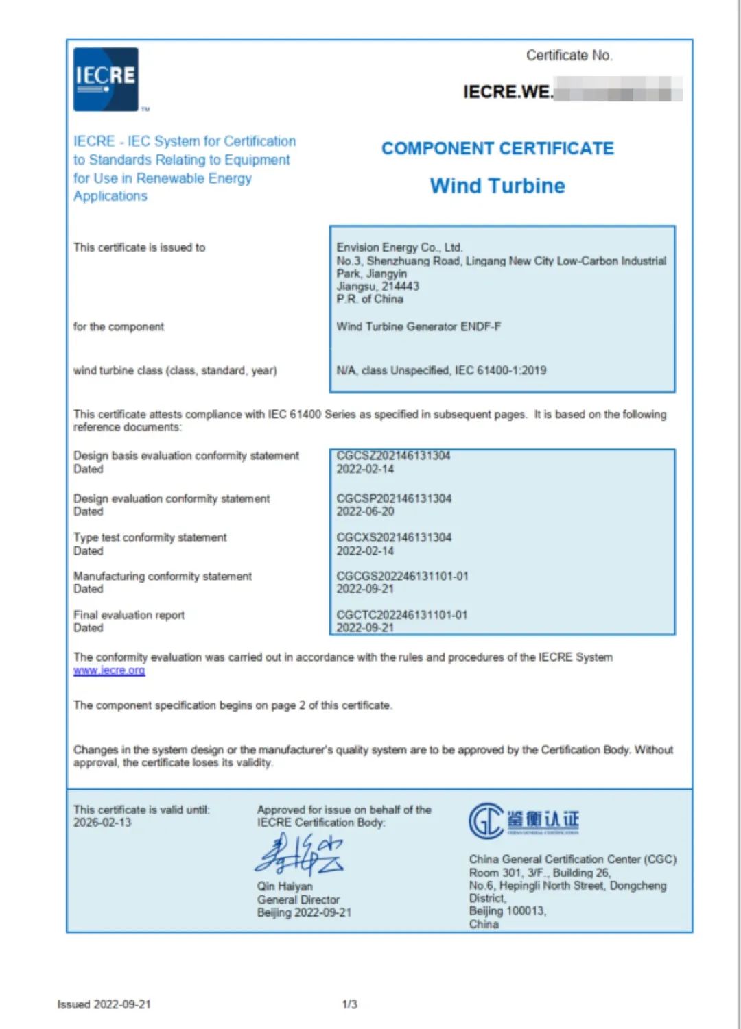 远景自研发电机率先引入了高速直冷、950V/1140V三电平、海上双馈等创新技术。基于供应链、质量、制造管理上的丰富经验和信息化优势,远景深度介入自研发电机生产的各个关键环节,引入BIQ系统严格管控关键过程参数,确保设计生产一致性。所有远景自研发电机均获得第三方机构部件认证,在国内率先获得更高标准的IECRE零部件认证,还依托欧盟及地方合规认证,随远景风机出口应用到法国等多个海外项目。