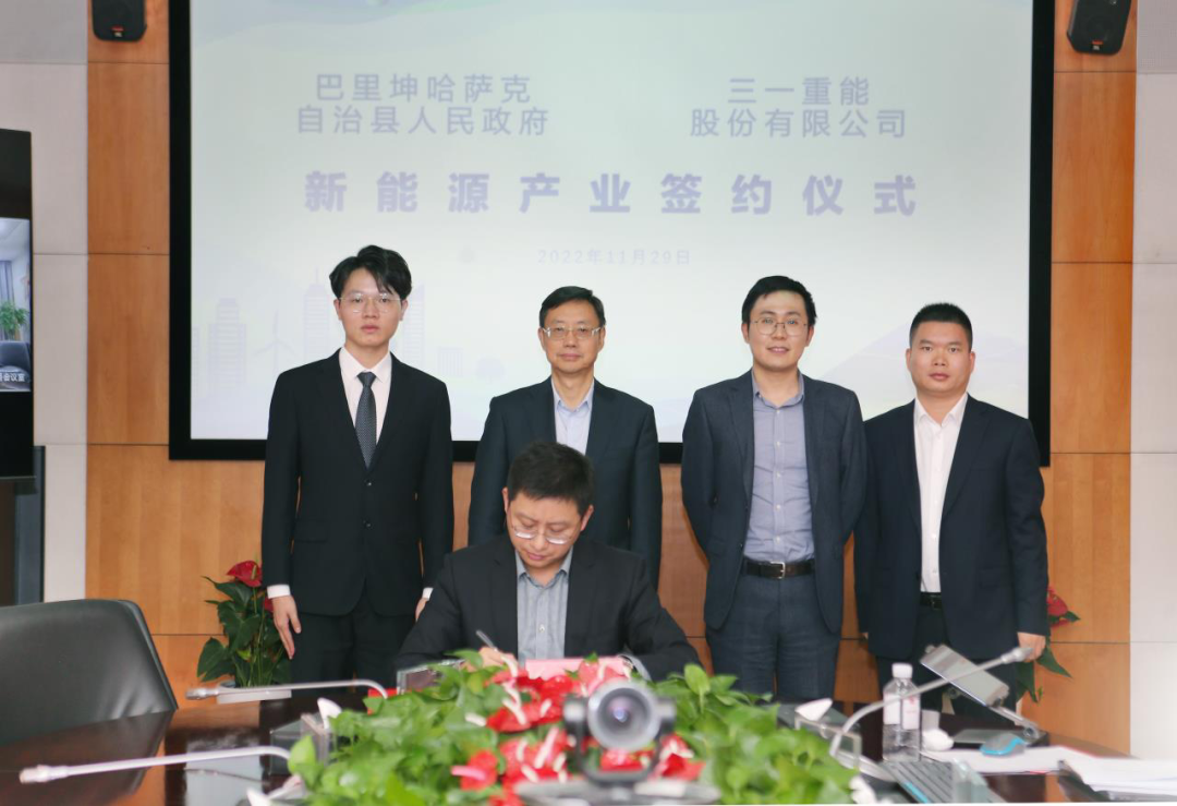 11月29日,三一重能股份有限公司(简称”三一重能“)与新疆哈密市巴里坤哈萨克自治县人民政府(简称”巴里坤县“)举行线上云签约仪式。巴里坤县委副书记、县人民政府县长瓦里汗与三一重能副总经理、营销公司总经理余梁为代表双方在招商引资协议上签字。