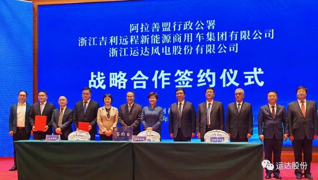 10月13日,浙江运达风电股份有限公司与内蒙古自治区阿拉善盟行政公署、浙江吉利远程新能源商用车集团有限公司(以下简称:吉利远程商用车集团)在阿拉善签订三方战略合作协议。阿拉善盟盟委书记黄雅丽,盟委副书记、盟长李中增;吉利控股集团高级副总裁俞学良,吉利远程商用车集团投资发展总监李哲峰;运达股份党委书记、董事长高玲出席签约仪式。